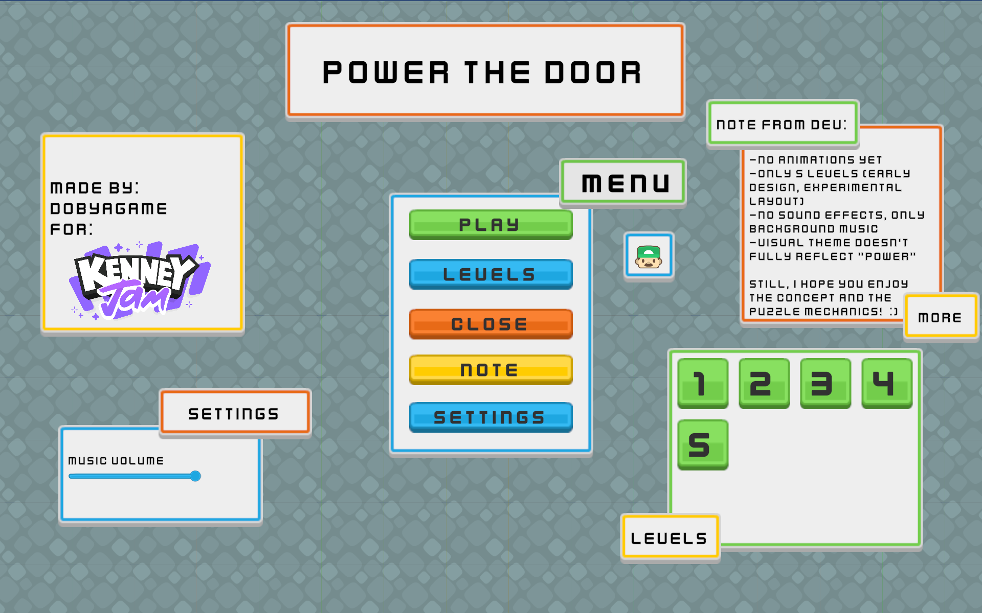 The visuals are deliberately minimal and built using assets from the Kenney Sokoban pack. While not all graphics directly express the “Power” theme, the gameplay is built entirely around it.